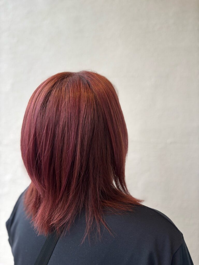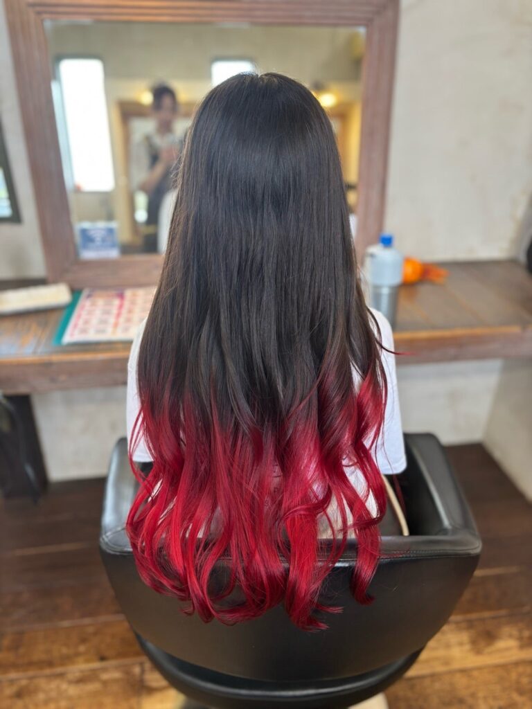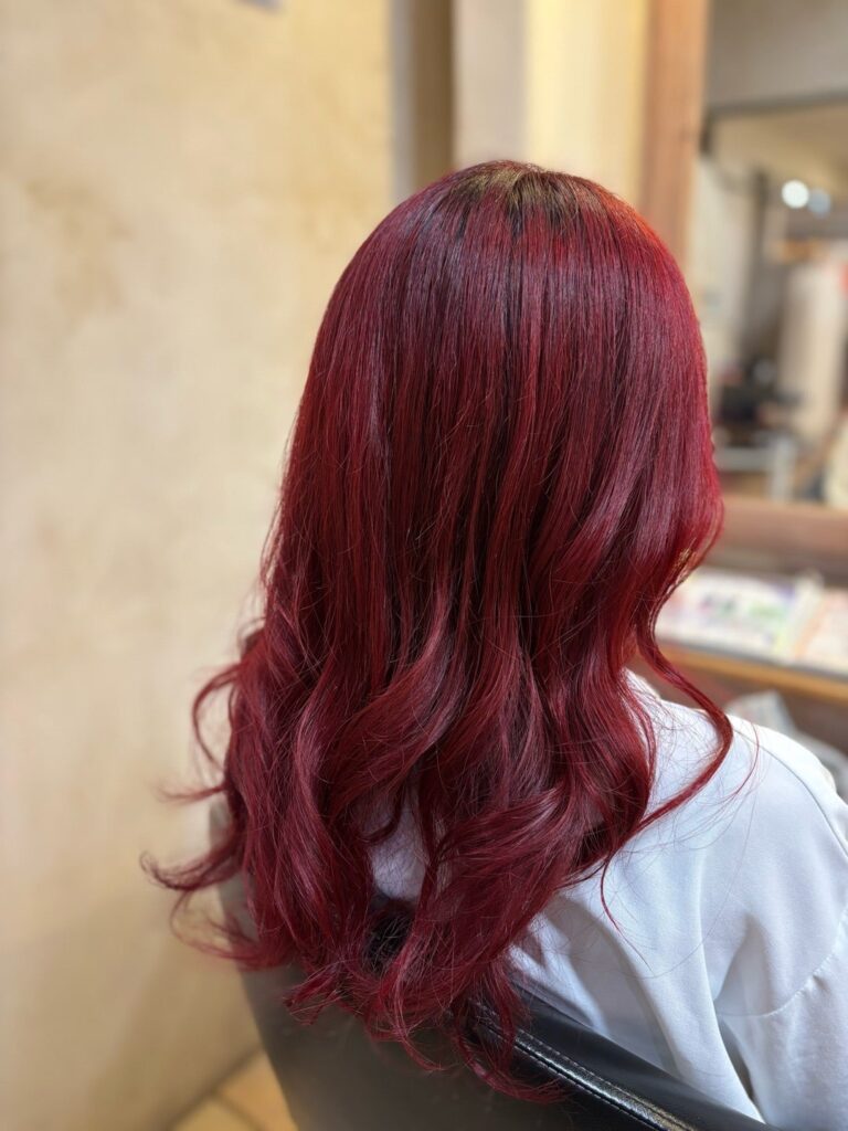 裾をブリーチで明るくしてライトなチェリーレッドで、イベントでも目立つかっこかわいいカラーに🍒